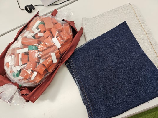 今回試作品をつくるにあたり、「ビニール袋にいれた廃材をつつむ布」が必要であるという提案が社員からあがりました。そこで「綾瀬高校生徒からの提案」という点に共感いただいた、スリーハイと取引があるアパレル企業から、廃材の布を譲っていただくことができました。