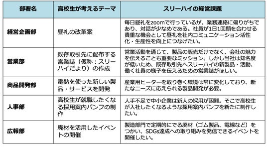 今回実現したアイディアは、これら5つのテーマのうち、「営業部」と「広報部」に配属された生徒が考えたものです。