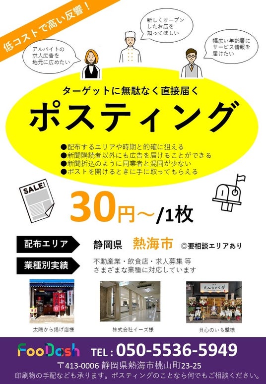 2023年10月にFooDashサービスの統括マネージャーとして入社以来1年になりますが、ポスティングはこのサービスの基本を育む重要な作業と言えます。様々な広告活動の全体を通しても、お客様宅のポストまで情報をお届けすることで得られる反響・フィードバックの割合はとても大きく、実際のサービス売上に直結する大切な役割を担っています。配達を始め日ごろ常に熱海を移動し続ける私たち配達員は、街の「今」を誰よりも感じ取っているという自負があります。ホテルや別荘が数多く立ち並び、観光客も移住者も混じり合う特殊な街だからこそ、広告活動も時には複雑になってきます。弊社のポスティング経験と知識を活かし、熱海の事業者の皆様の役に立てたらと思いますので、ぜひお気軽にご相談ください。