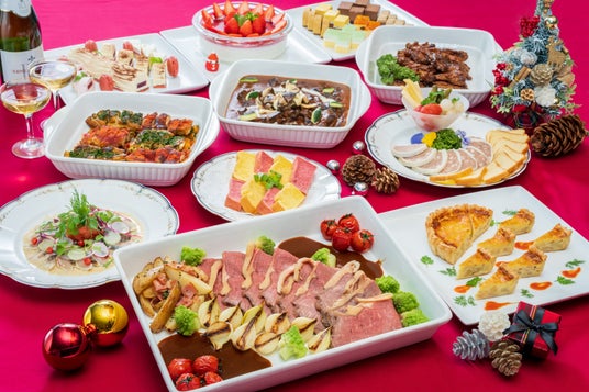 牛肉の赤ワイン煮や、燻製チキンのローストアーモンド風味、カニクリームコロッケなど、大人も小人も満足いただけるメニューが充実。さらにブッシュ・ド・ノエルをはじめ、ケーキやムース、アイスなどのデザートも食べ放題。クリスマスデートはもちろん、ご家族やグループでも賑やかにお過ごしいただけます。
