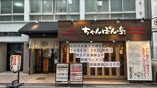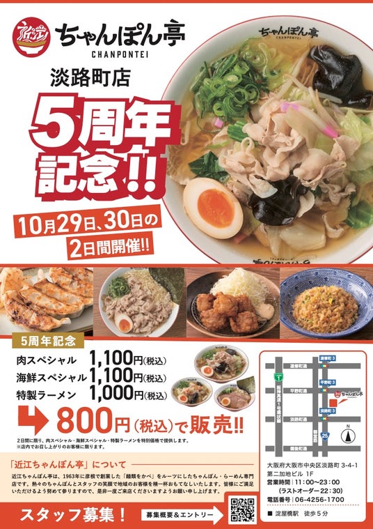 ドリームフーズ株式会社(本社:滋賀県彦根市、代表取締役:山本英柱)は、地域の皆様に愛され続ける「近江ちゃんぽん亭 淡路町店」が5周年を迎えることをお知らせいたします。これまでのご支援に感謝し、2024年10月29日(火)・10月30日(水)の2日間、特別価格での人気メニュー提供を実施いたします。地域の皆様に感謝の気持ちを伝え、さらなるご愛顧をお願いするこの機会に、ぜひご来店ください!