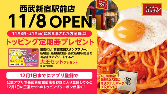 株式会社パンチョ(東京都武蔵野市:CEO 野尻圭介)は、「スパゲッティーのパンチョ 西武新宿駅前店」を2024年11月8日(金)に新規開店します。