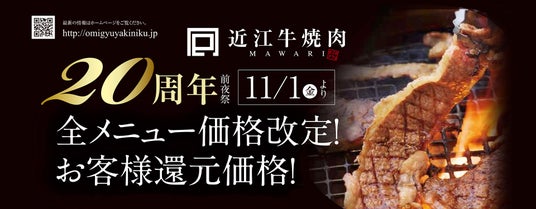 近江牛焼肉 MAWARIでは、20周年を記念して、単品メニューの価格を改定!「お客様還元価格」にてご提供いたします。【2024年11月1日(金)~】