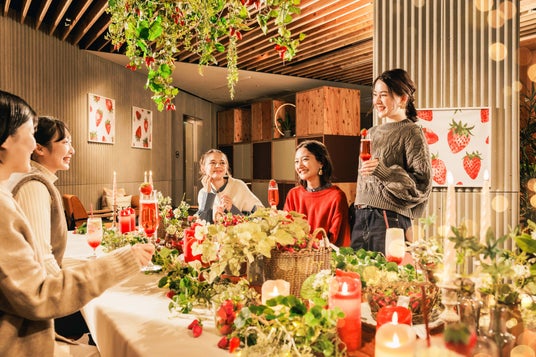 「居酒屋以上 旅未満」の体験を提供する「星野リゾート BEB5土浦(ベブ)」は、2025年1月15日から4月15日までの期間、スイーツやドリンクでいちごを楽しみ尽くすイベント「BEB ストロベリーナイト」を開催します。いちご色のキャンドルやいちごの装飾でパブリックスペース「TAMARIBA(タマリバ)」がいちご尽くしの空間に変身。茨城県オリジナル品種「いばらキッス」を贅沢に使用したドリンクや体験型スイーツ「たっぷりいちごソースのディップチュロス」を販売します。いちごに囲まれた夜のきらびやかな空間の中、スイーツでもドリンクでも「いばらキッス」を存分に楽しむことができます。