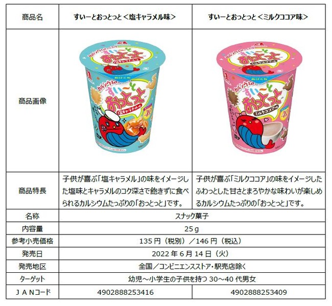 「おっとっと」は今年で発売から40周年を迎えました。「おっとっと」はお菓子の形を言い当てる楽しさで、親子の会話がうまれ、親子で一緒に楽しんでいただけるお菓子として、幅広い世代に長年ご愛顧いただいております。今回は、40周年を迎えるにあたり、親子で楽しむ機会をより多く提供していきたいという思いから、いつもの「おっとっと」と一味違う味わいを楽しんでいただけるように、お子様にも喜んでいただける甘いフレーバーの「おっとっと」を新発売いたします。「すいーとおっとっと<塩キャラメル味>」は、塩味とキャラメルののコク深さがスナックの軽い食感とマッチし、食べ出すと止まらないクセになる味わいです。「すいーとおっとっと<ミルクココア味>」は、お子様に人気の「ミルクココア」をイメージしたふわっとした甘さとまろやかな味わいが楽しめます。お子様にとって嬉しいカルシウムも配合されているうえ、「塩キャラメル」と「ミルクココア」を長年発売している当社が品質にこだわり開発しました。また、40周年を迎えることができた感謝をお客様にお伝えするため、40周年限定のいつもと違う「おっとっと」のキャラクター「とと丸」と「ととみ」が、あまーいおっとっとにちなみ、甘いセリフをつぶやいているパッケージもお楽しみいただけます。「おっとっと」発売40周年を機に、スナック市場の活性化を図ってまいります。
