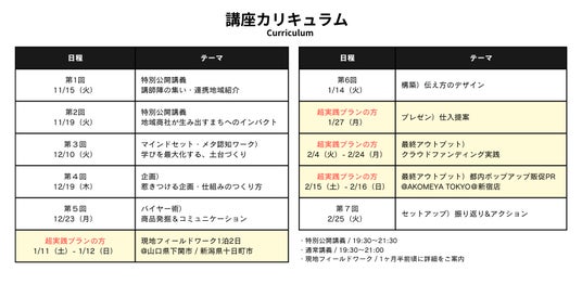 本プログラムでは、株式会社WHERE、東海旅客鉄道株式会社(以下、JR東海と記載)、株式会社AKOMEYA TOKYO、株式会社パンクチュアル、women farmers Japan株式会社の5社が協働し、受講生に山口県下関市と新潟県十日町市へ視察をおこない、両地域に眠る魅力的な商品の発掘から、都内ポップアップイベント及びクラウドファンディングの販促PRまでを実践しながら、マーケティングスキルを身につけていきます。