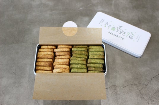 【PEAceNUTSホリデークッキー缶】煎り落花生が香ばしいプレーンとホリデーカラーな抹茶のハーフ&ハーフ