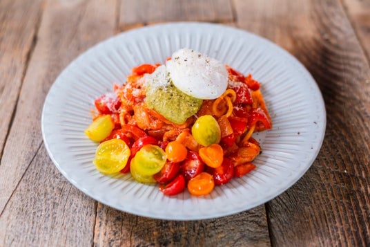 特製のトマトソースは飴色に煮込んだ玉ねぎを混ぜ合わせ、トマトの旨味の中にもほのかな甘味を感じるこだわりのソースです。カラフルなトマトは見た目も華やかで、ピリ辛が食欲をかきたてる女性人気が高い一皿です。