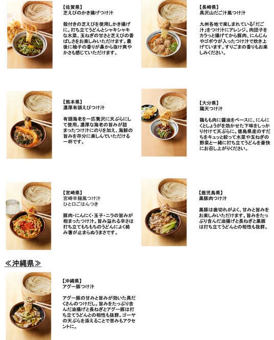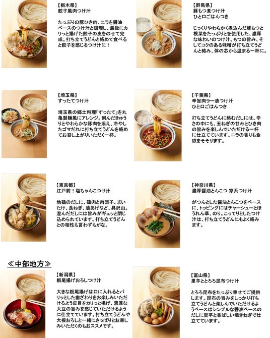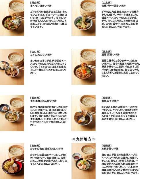 丸亀製麺でご当地商品を全国一斉に展開をするのは、初めての取り組みとなります。国産小麦、塩、水のみからつくる「打ち立て・生」のうどんに最高に合う、それぞれの地元の食文化を活かした「つけ汁」をお楽しみください。