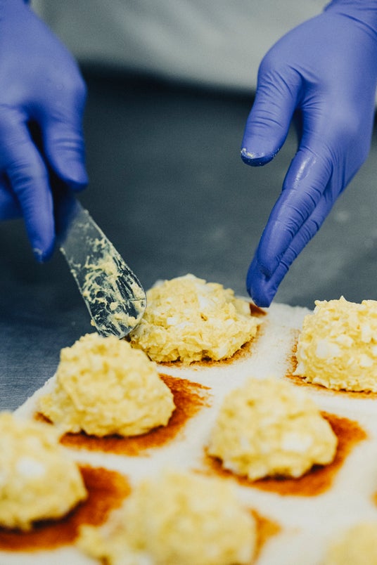 創業して以来、「サンドイッチのダイヤ」といわれるほどサンドイッチに定評がありました。その所以は、「たまごサンド」にあると考えています。どの工程にも必ず人の手のひと手間を加えることを惜しまず、ゆで卵をつぶす際も、白身が少し大きめに残る頃合いの見極めを職人が見守り判断しています。そしてそのたまごに合わせるのが自家製マヨネーズです。このマヨネーズは、ダイヤ製パンのサンドイッチの命とも言える大切なもので、創業者の多田定男が自ら開発し、たどり着いた味です。これがいまでも守り継がれ、ダイヤ製パンの看板商品である「たまごサンド」になっています。
