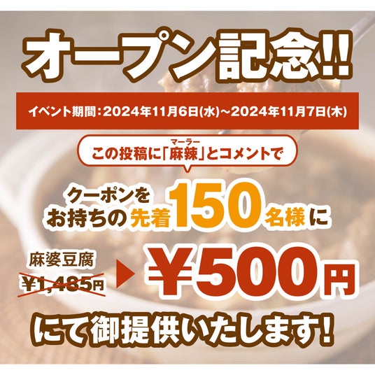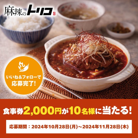 Instagram公式アカウントをフォローした方限定で、2024年11月6日(水)~2024年11月7日(木)の2日間で「トリコの麻婆豆腐定食(¥1,485)」をワンコイン500円でプレゼント!