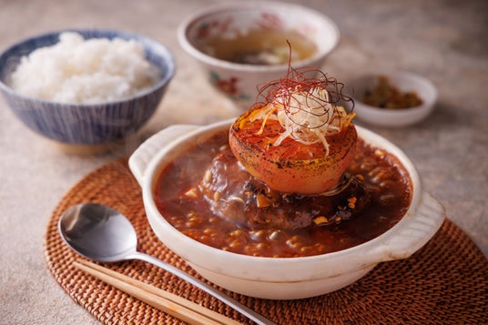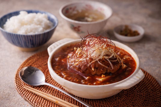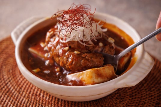 ジューシーなハンバーグが丸ごとトッピングされ、自分で崩して味わう楽しさも抜群!