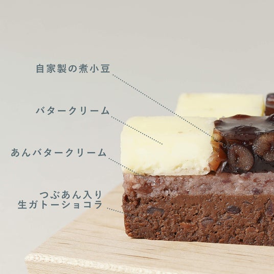 上部にはバターと大納言小豆の粒をしっかり残した自家製の煮小豆を大胆にのせ、さらにその下にガトーショコラ生地とあんバターをつなげる「あんバタークリーム」を挟むことで、あんこの上品で優しい甘さとバターのコクがチョコレートと一体となって広がります。