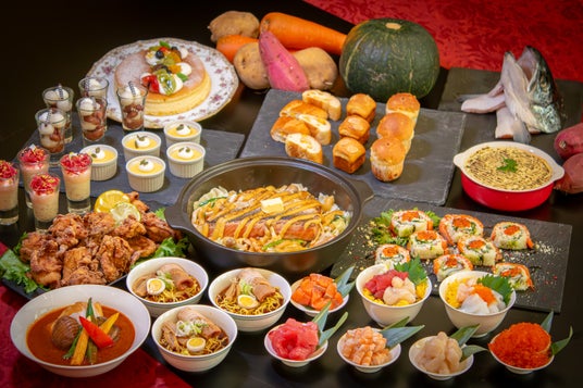 北海道名物料理ジンギスカンとイギリス名物シェパーズパイのフュージョン料理ジンギスカンシェパーズパイや若鶏のザンギ、札幌名物スープカレー、鮭のちゃんちゃん焼き、サーモンとチーズのサラダロール炙り焼き、そしてサーモンやいくら、ほたて等をお好きなだけ盛れる海鮮丼、こだわりの自家製出汁の旭川醤油ラーメンなど、大地と海の味覚をお好きなだけ味わえる内容になっております。またビュッフェ内にはライブキッチンで焼き上げる鉄板焼きステーキ、沖縄県産の島豚しゃぶしゃぶ等、豊富なお料理を揃えた、年末の集まりにふさわしい充実のビュッフェ内容です。