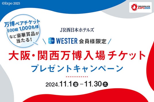 株式会社ジェイアール西日本ホテル開発(京都府京都市下京区、代表取締役社長 伊勢正文)は、JR西日本ホテルズの5ブランド12ホテルにて、WESTER会員様を対象とした「WESTER会員様限定 大阪・関西万博入場チケットプレゼントキャンペーン」を、2024年11月1日(金)から11月30日(土)に実施いたします。