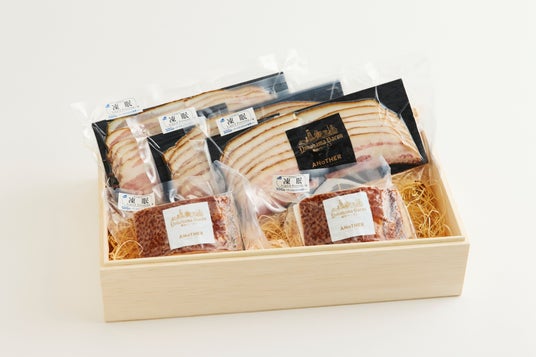 また、株式会社テクニカンが販売する「横浜ベーコン」も併せて展開。テクニカン山田の家業が食肉業を営んでおり、自身の家族や大切な方にのみお作りしていた秘伝のベーコンを商品化したものです。長期間の塩もみ、燻製によって上質な肉質に仕上がった手作りベーコン。更なる美味しさを追及し、パッケージも帝国ホテル向けに美しく仕上げており、贈り物にもピッタリです。