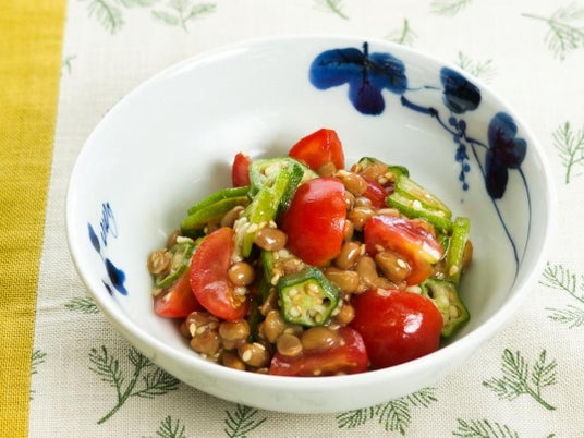 食卓の定番である「納豆」に旬の野菜(オクラ、トマト)を加え、中華風サラダにアレンジしました。ごま油と白ごまの香り、黒酢の酸味で納豆独特の匂いを軽減し食べやすく仕上げています。加熱しない生のオクラの食感がおもしろい一品です。火を使わずに簡単に作れます。