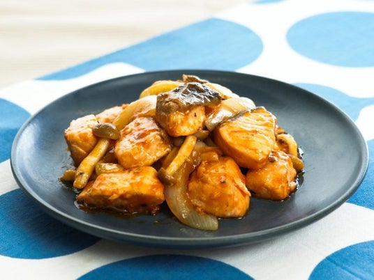 エビチリのえびを鮭にして和風にアレンジしました。豆板醤を使用せず、甘辛の甘みを「追いがつお(R)つゆ2倍」で、辛味を七味とうがらしで再現しました。辛さは七味とうがらしの量で調整することができます。しめじやたまねぎも加え、ボリュームのあるおかずになります。