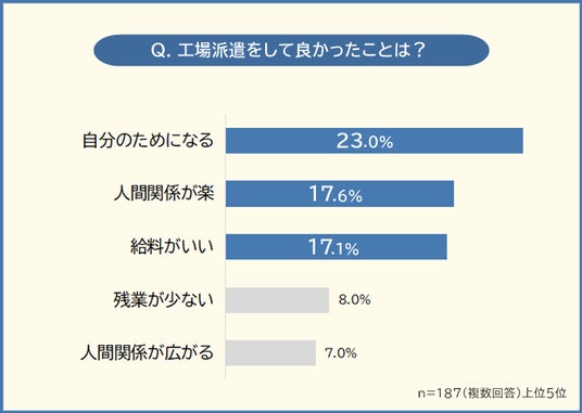 工場派遣をして良かったことの1位は「自分のためになる(23.0%)」でした。2位「人間関係が楽(17.6%)」、3位「給料がいい(17.1%)」が続きます。