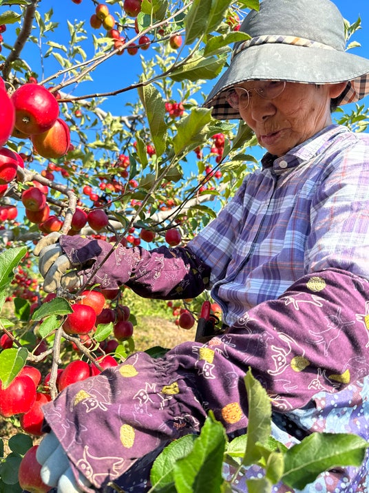 「アルプス乙女」はその名の通り、可憐で小さな、直径5cm前後のミニりんごです。重さが30~50gくらいで、果皮は真っ赤で軸はやや長く、とてもかわいらしい姿をしています。サイズが小さい分、通常のりんごの約2~3倍手間ひまがかかると言われています。