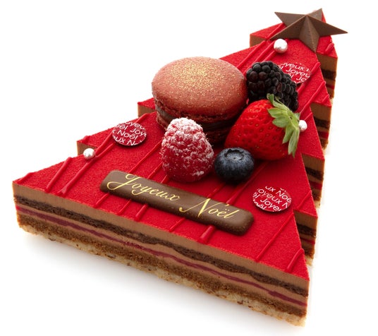 真っ赤なツリーの形がキュートなケーキ「サパン センシュエル」。優しい甘さのクレーム オ ショコラの口溶けにジュレフランボワーズの酸味が絡み合う、その名の通り「官能的」な一品。ショコラの深く濃厚な味わいと軽やかなフランボワーズのマリアージュをお楽しみください。