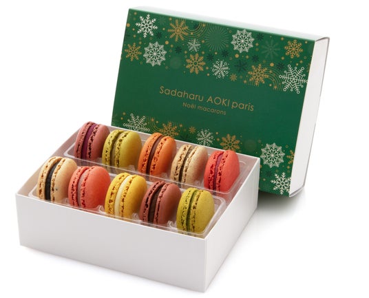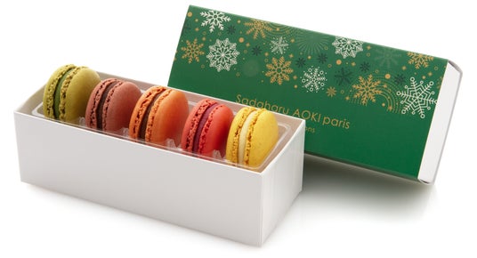 スペイン産アーモンドで仕立てた生地に、素材の味を活かしたガナッシュを挟んだアオキのマカロンは、長い年月をかけて生み出した自慢のスペシャリテ。生地の美味しさはさることながら、それぞれのフレーバーの個性的な味わいが光る逸品。クリスマス仕様の華やかなパッケージで登場です。