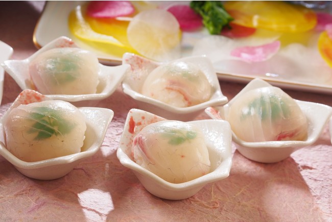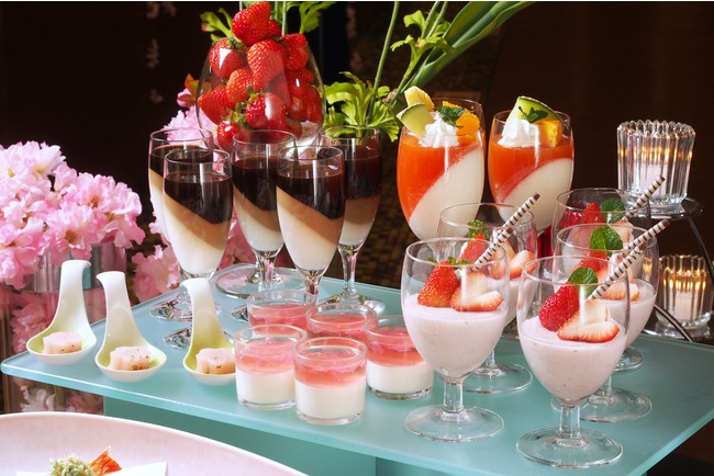 桜の塩漬けの杏仁豆腐と花びらのゼリーや春苺のムース