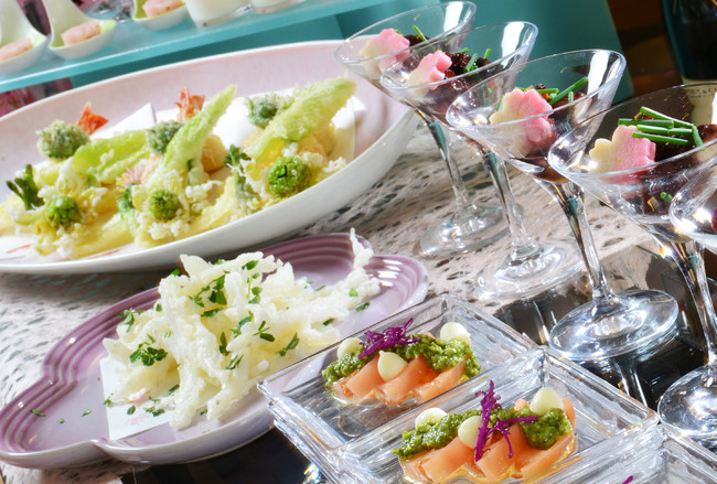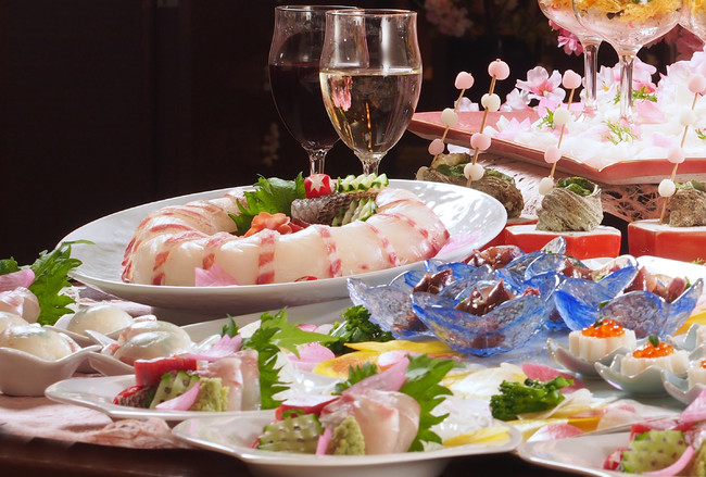 トリュフ薫るポテトサラダ、天然鯛の手毬寿司、ちらし寿司、カプレーゼ、桜花長芋のいくらのせ、ほたる烏賊菜の花のペペ、さざえエスカルゴバター焼き、百合根団子の黄味まぶし、蛸柔煮桜麩