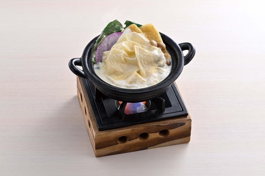 比叡巻き湯葉と引き上げ湯葉の豆乳小鍋 888円(税込977円)