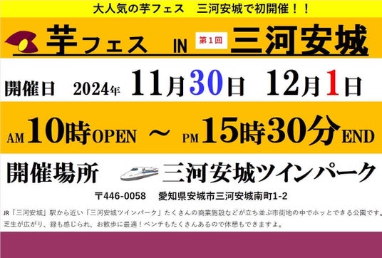 株式会社ロトが主催する「第1回芋フェス!IN 三河安城」が、2024年11月30日12月1日、三河安城駅前ツインパーク公園での開催を行います。