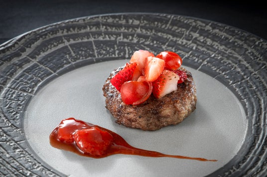 肉汁溢れ、燻製香るソースのハンバーグと甘酸っぱい苺の酸味がマリアージュする稀代の逸品。