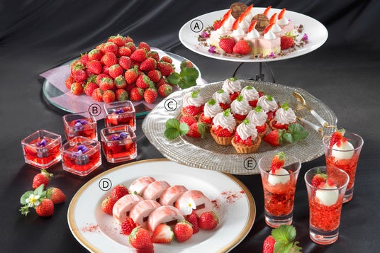 苺とベリーのロールケーキ ホワイトチョコレートとともに/一口苺大福/フレッシュ苺とミルクジュレのグラス仕立て 練乳をお好みで/ホテル特製苺のショートケーキ/なめらか苺プリン/ソフトクリーム など