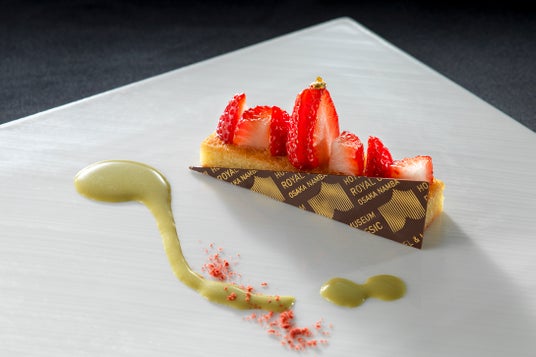 アーモンドクリームをしっとりと焼きあげたダマンドに苺を飾り、ピスタチオソースで彩りました。目の前で完成する華やかな一皿をお楽しみください。