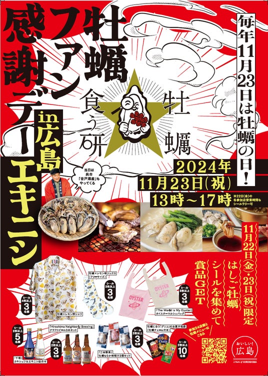 “広島を世界一美味しく牡蠣が食べられる街へ” を目指して2019年より活動する「牡蠣食う研」は、この秋で発足5周年を迎えます。10月には、地域での継続した取り組みが認められ、「2024年度グッドデザイン賞」を受賞いたしました。これを記念し、11月23日(祝)に「牡蠣ファン感謝デーin広島エキニシ」、前日22日(金)の各店営業時間中に「牡蠣ファン感謝デーイブ」を実施いたします。
