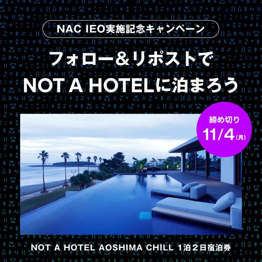 NOT A HOTEL DAO株式会社(代表取締役CEO:濱渦伸次)は、本日10月31日11:00より、GMOコイン株式会社(代表取締役社長:石村富隆)にて「NOT A HOTEL COIN(NAC)」のIEO(Initial Exchange Offering)申し込みを開始しました。また、同時にプロジェクトの詳細を記載したホワイトペーパーと新Webサイトを公開しました。