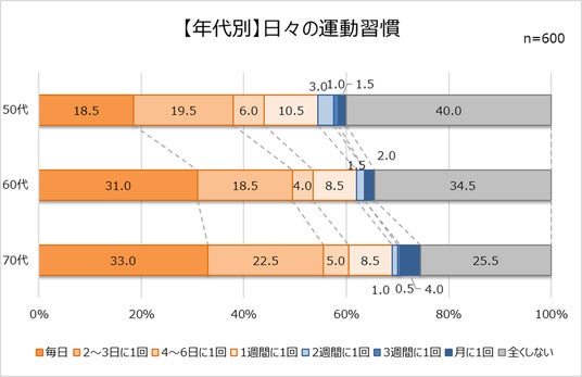 運動習慣では、50歳代では運動を「全くしない」人が約4割いる一方で、60歳代は3割台、70歳代は2割台と少なくなり、日ごろから運動している人は70代が一番高くなりました。毎日運動している人も50歳代に比べ、60・70歳代の方が多いことが明らかになり、年代が上がるにつれて、運動の意識が高まっていることが分かりました。