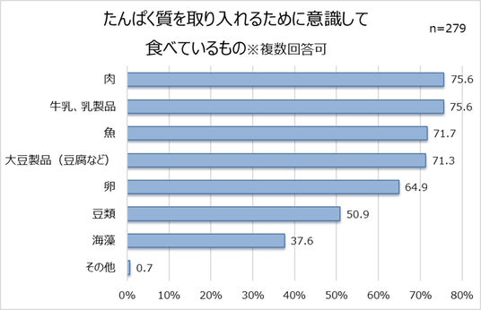 意識して食べているものについて尋ねると、7割以上の人が「肉」「牛乳・乳製品」「魚」、大豆製品」といった食材を意識して取っていることが分かりました。