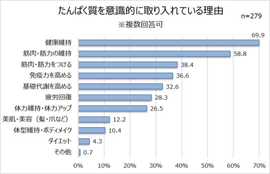たんぱく質を意識的に取っている人に、その理由について聞いたところ、約7割の人が「健康維持」と回答。次いで、「筋肉・筋力の維持(約6割)」、「筋肉・筋力をつける(約4割)」となりました。筋肉・筋力のためにたんぱく質を取っている人が多いようです。