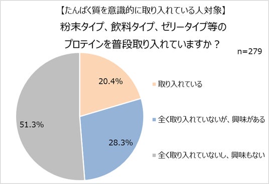 また、たんぱく質を取るための方法の一つとして、サプリメントであるプロテイン関連商品が挙げられますが、本調査ではふだんからプロテイン(粉末・飲料・ゼリータイプ)を取る人は約2割にとどまり、5割以上が「取り入れていないし興味もない」との回答でした。