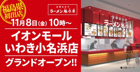 京都北白川ラーメン魁力屋をチェーン展開する株式会社魁力屋(https://corp.kairikiya.co.jp/本社:京都市中京区、代表取締役社長:藤田 宗、以下魁力屋)は、2024年11月8日(金)に「京都北白川ラーメン魁力屋 イオンモールいわき小名浜店」を福島県いわき市にグランドオープンいたします。