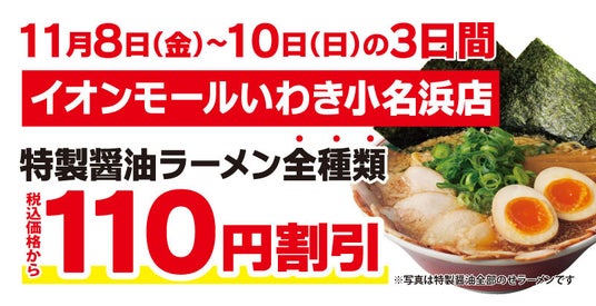 この度オープンを記念して、「イオンモールいわき小名浜店」にご来店いただいたお客様には、『特製醤油ラーメン全種類』を税込価格から110円割引で販売いたします。