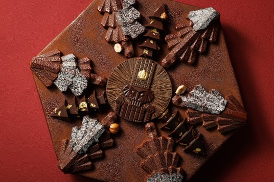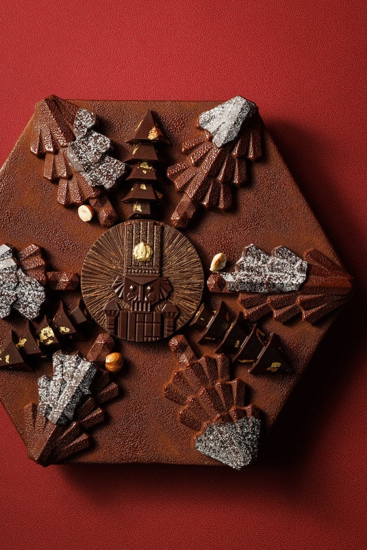 ブランドを象徴する六角形のケーキにクリスマスモチーフのショコラを飾ったクリスマスケーキです。ザクザクとした食感のヘーゼルナッツとショコラのサブレ、マダガスカル産カカオ75%ショコラのクリームとショコラのビスケットが層になったケーキに、今年のクリスマスコレクションのテーマである“くるみ割り人形”が描かれたショコラを中央に飾り、もみの木を模ったショコラとムースをトッピングしています。カカオの風味際立つショコラをさまざまな食感とくちどけでご堪能いただけます。