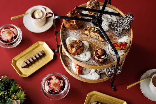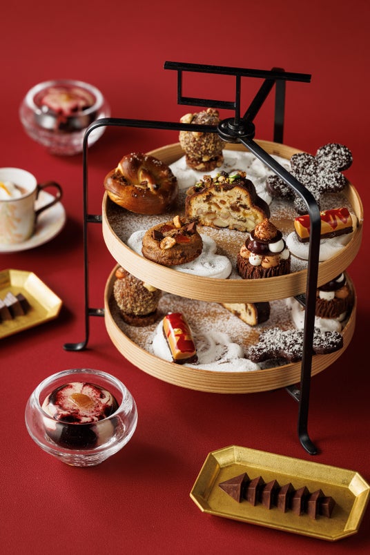 クリスマスをテーマにした10種のクリエイションを楽しめるショコラ尽くしのアフタヌーンティー。ジンジャーマンを模ったサブレ・ショコラ・ココ、カカオニブをトッピングしたプレッツェルやキャラメル風味の小さなブッシュ・ド・ノエルやシュトーレン、クリスマスツリーを模った大きなショコラなど、季節を感じられるラインナップ。どれも厳選されたカカオ豆から作られたショコラを使用し、カカオの風味を様々なクリエイションと共にお楽しみいただけます。