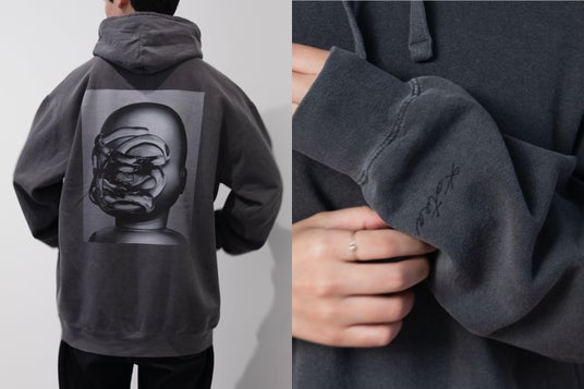 友沢こたおさん作品の《Slime CCVI》をフーディーの背面に印刷しました。袖口には友沢こたおさんのサインが入っています。作品の色合いに合わせたダークグレーのフーディはこれからの季節にぴったりな一着です。