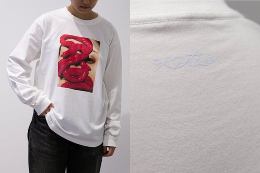 今回の展示のKVにもなった《Slime CCV》の作品を印刷したロングTシャツです。バックには友沢こたおさんのサインが入っております。生地はなめらかな触り心地で、程よくしっかりした生地厚が特徴です。季節を選ばずお使いいただける一着です。