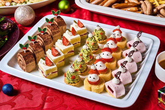 心弾むクリスマスを纏うスイーツたちクリスマス気分をさらに盛り上げる愛らしいスイーツが勢ぞろい。フルーツやチュロスなどにお好きなだけチョコレートをディップできるチョコレートファウンテンや、ブッシュドノエルはもちろん、ツリーやサンタクロースをイメージしたピスタチオのタルトや苺のロールケーキなど、どれを食べようかついつい迷ってしまう品揃えです。