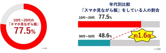 スマホを見ながら一人で食事をする、通称「スマホ見ながら飯」をしている人は、10~20代では77.5%という結果に。さらに「スマホ見ながら飯」の頻度を聞くと「毎日」「ほとんど毎日」という回答が62.5%となり、若者の多くに「スマホ見ながら飯」が定着していることが伺えます。さらに、10~20代の「スマホ見ながら飯」の割合は30~50代の約1.6倍にもなることがわかりました。動画やSNSなど、スマホ一つで楽しめるコンテンツに小さい頃から慣れ親しんでいる若者世代にとって、「スマホ見ながら飯」は当たり前の行動になってしまっているのかもしれません。