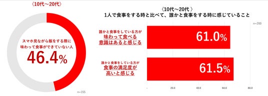 10~20代の「スマホ見ながら飯」をしている人に向けて、「味わって食事ができているか」と質問すると、46.4%が「味わって食事ができていない」と回答しました。また、10~20代に「スマホ見ながら飯」をしている環境について聞くと、84.5%の人が週に4日以上一人で夕食をとっていることが分かりました。この結果からも食事の環境が「スマホ見ながら飯」の習慣化につながる要因になっている可能性が考えられます。一方、誰かと食事する場面について聞くと、61.0%が「一人の時に比べて誰かと食事をしている方が味わって食べる意識はある」と答えました。また、誰かと食事をしているときの満足度についての質問では「一人の時に比べて食事の満足度が高いと感じる」と答えた人が61.5%になり、一人のときより、誰かと食事をしているときの方が、食事をおいしく食べていると感じる人が多いことが明らかになりました。