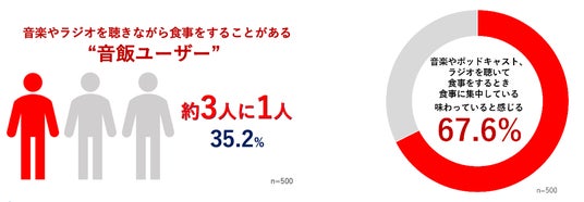 そのうち、「音楽やポッドキャスト、ラジオを聴いて食事をするときは食事に集中している・味わっていると感じる」と回答した人が67.6%となり、音楽やラジオを聴きながら食べる「音飯」は、「スマホ見ながら飯」より健康的な食習慣につながると考えられます。