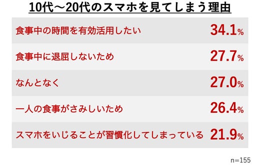 また、「スマホ見ながら飯」をしたことがある10~20代に対して理由を聞くと、約4人に1人が「一人の食事がさみしい」、約5人に1人が「スマホをいじることが習慣化してしまっている」と回答。また34.1%が「食事中の時間を有効活用したい」と答えました。10~20代は食事の時間にもスマホが手放せなくなっていると考えられます。
